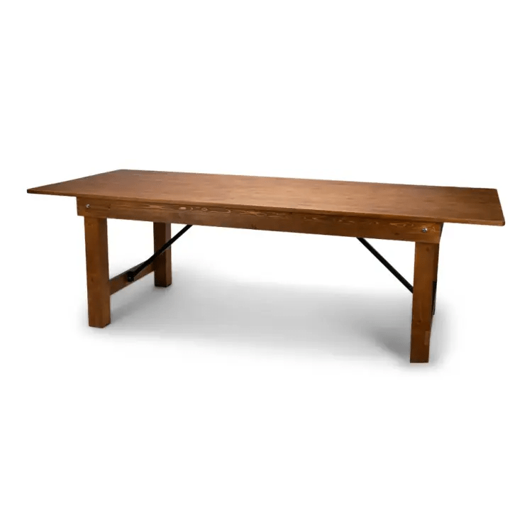 An elegant, rustic farm-style table measuring 8 feet long by 40 inches wide — perfect for seating a long family meal, buffet line, or a decorative display at weddings, receptions, corporate events, and backyard gatherings. The fruitwood finish gives the tabletop a warm, natural grain that complements both casual and formal décor. Its generous length provides ample surface area for place settings, centerpieces, or food service, while the 40" width balances comfort and accessibility across the table. Durable and sturdy enough for frequent rental use, this table brings classic farmhouse charm to any event without taking up unnecessary visual space. Ideal for communal dining, serving stations, or as a focal tabletop for décor and signage.